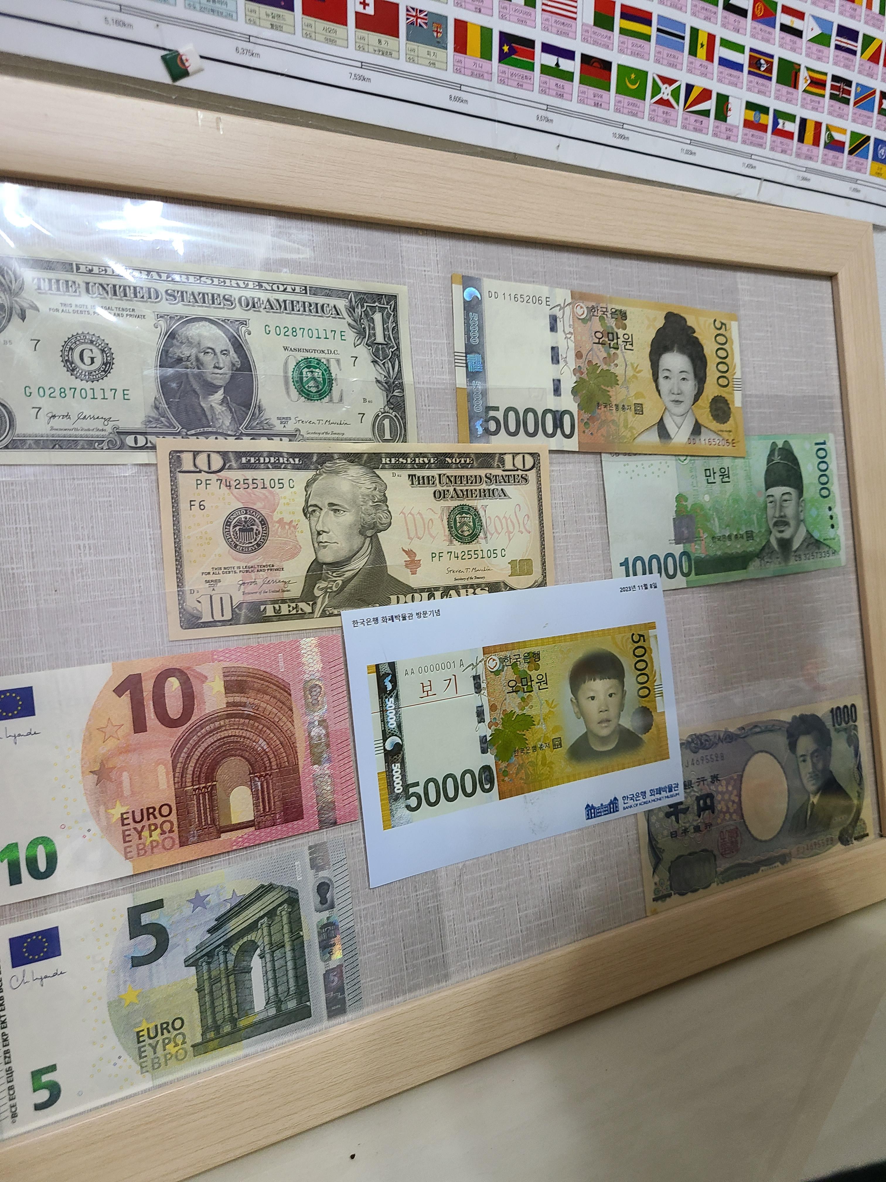 제가 은행에서 10만원어치 환전을 해서 여러 나라 화폐를 같이 전시해뒀거든요 ㅎㅎ